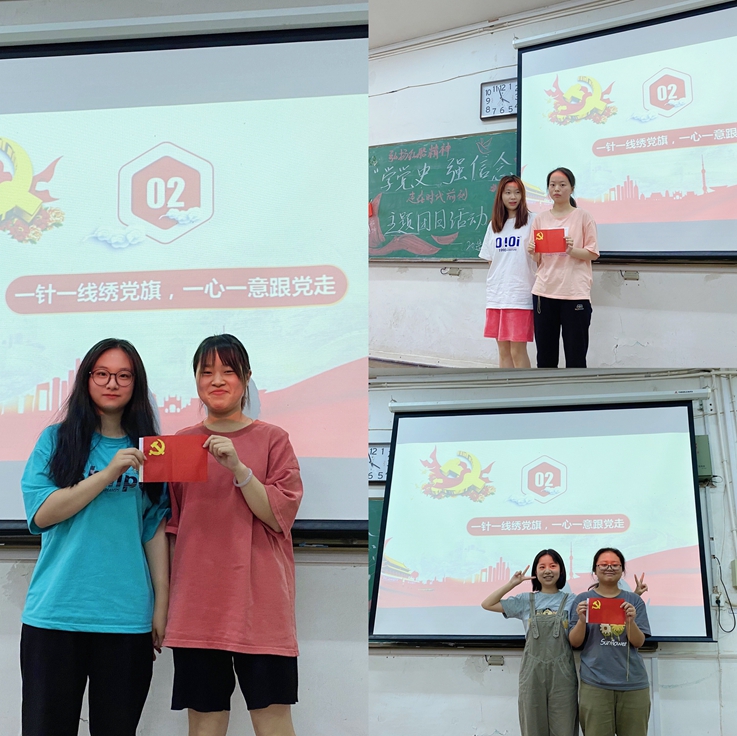 追忆峥嵘岁月,接受红色洗礼,20级会计专业团支部书记向大家分享了陈延年和陈乔年同志的革命事迹,并展示了革命影片《觉醒年代》相关片段;赵崇庆同学以一篇《朱德的扁担》向大家讲述朱德和红军指战员一起挑粮的故事,感悟到共产党人团结互助、同甘共苦的优良传统;有的班级组织了模仿秀并一起观看了《鉴史知来—跟着总书记学党史》;20级造价团支部组织了绣党旗活动,同学们在一针一线中体会中国共产党走过的百年路程,让党旗永远飘扬在心中!