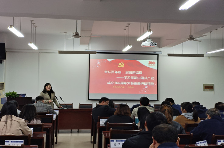马晓艳以《奋斗百年路 启航新征程——学习贯彻中国共产党成立100周年大会重要讲话精神》为题,深刻阐释习近平总书记“七一”重要讲话的重大意义、主要内容和丰富内涵,对讲话中提出的新思想、新观点、新论断进行系统解读,并结合高校教育工作者实际,对如何着力推动习近平总书记“七一”重要讲话精神落实到行动上,与学院教职工进行交流探讨。