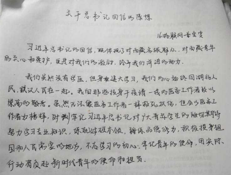 本网讯 2月21日,中共中央总书记、国家主席、中央军委主席习近平给正在北京大学首钢医院实习的17名西藏大学医学院学生回信,对于他们坚定树立献身医疗卫生事业的志向,总书记表示非常的欣慰,并鼓励他们练就过硬本领,服务基层人民。最后,正值藏历新年来临之际,向藏区各族群众致以美好的祝愿。