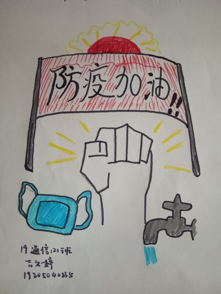 通知一经发出,便得到热烈响应,即便是从未接受过专业的绘画训练,同学们也毫不在意,19物联网工程2班的孙浩宇同学在第一时间提交了自己的彩绘作品,他表示:作为一名普通的大学生,面对这严重的疫情,宅在家中就是最大的贡献,当然“安心宅家≠无所事事”,此时此刻拿起画笔,希望可以用色彩陪伴大家共渡难关。