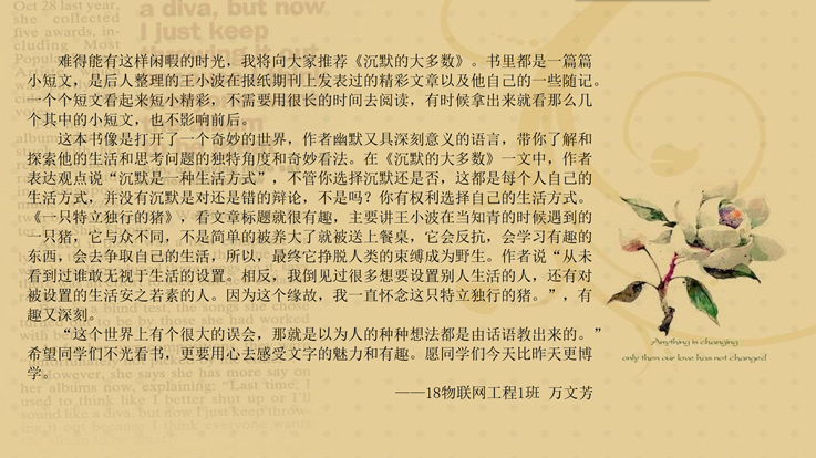 本网讯 书籍是人类重要的精神食粮。正值疫情防控关键时刻,为了向安心宅家的同学们营造一个充满书香与智慧的氛围,电信学院开展“线上书香 你我共阅”好书推荐活动,号召同学们以书为伴、以书为友,形成良好的阅读习惯,体验读书的乐趣。
