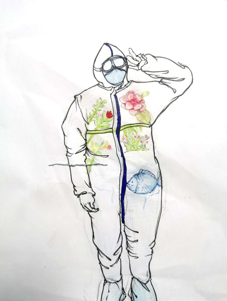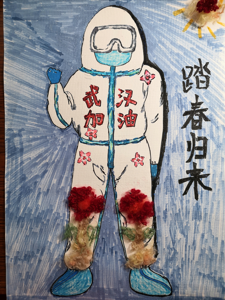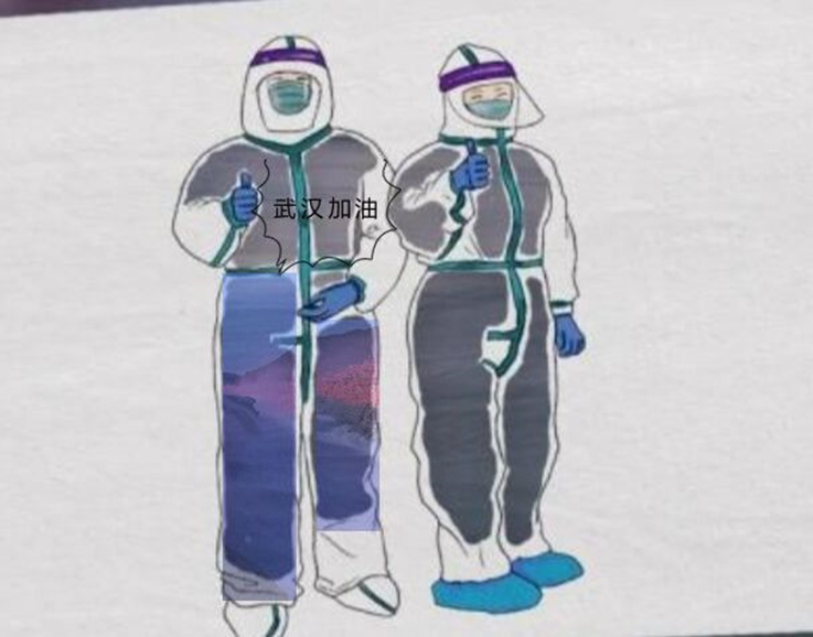 线上投稿持续了五天,同学们用自己的创意让原本单调无色的医护服装充满了色彩。“樱花红陌上 柳叶绿池边”,武汉的樱花映满了衣摆,领肩坠着几缕柳枝,通信工程一班的赵泽宇借这春暖花开的景象勾勒战衣,迎接战士们的归来,那袖口的中国红,紧握的拳头,也表达着众志成城,同仇敌忾的决心。计算机科学与技术专业的唐佶泽将黄河壶口之景融入到战衣之中;通信工程的蒋文涤将花环围绕在医护人员周围。还有很多选手都在作品上写下了“中国加油”“武汉加油”的字样,努力传递一份温暖和力量。