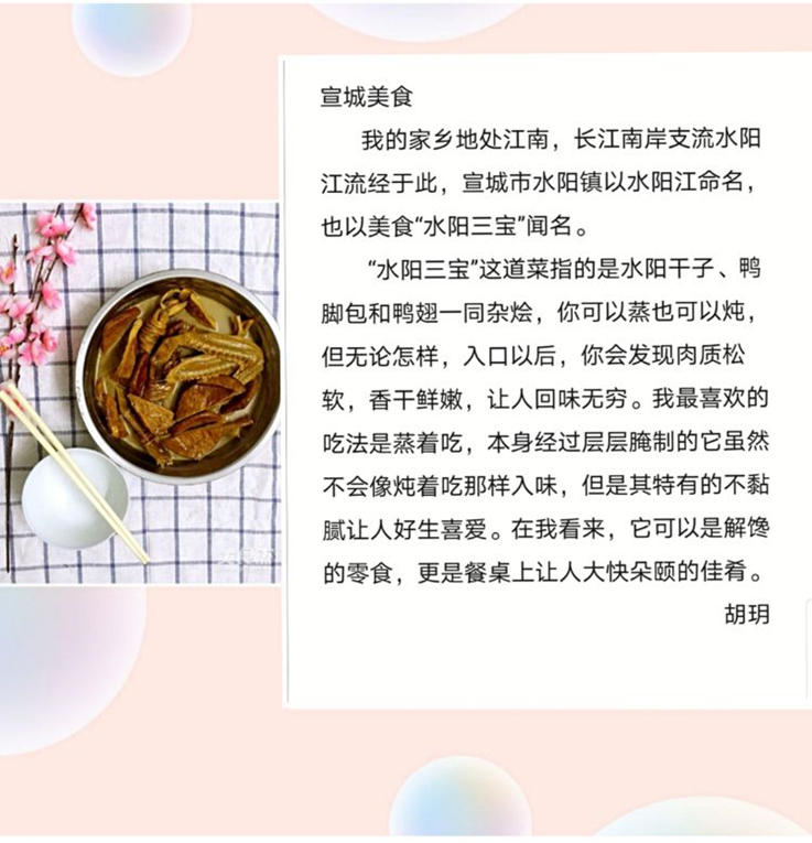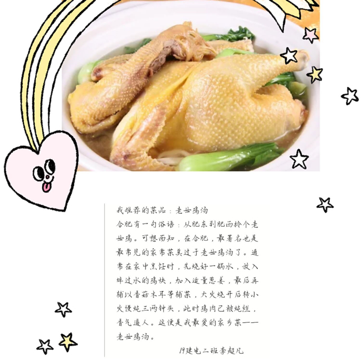 推介会上,来自五湖四海的同学们毫不吝啬,不遗余力的向大家展示着自己家乡的佳肴:宣城的“春卷”,安庆的“山粉圆子烧肉”,寿光的“王高虎头鸡”,阜阳的“地锅鸡”、池州的“葛公豆腐”、淮北的“羊蹄板面”、扬州的“蟹粉狮子头”等。似乎隔着屏幕,也能感受到四溢的香气。