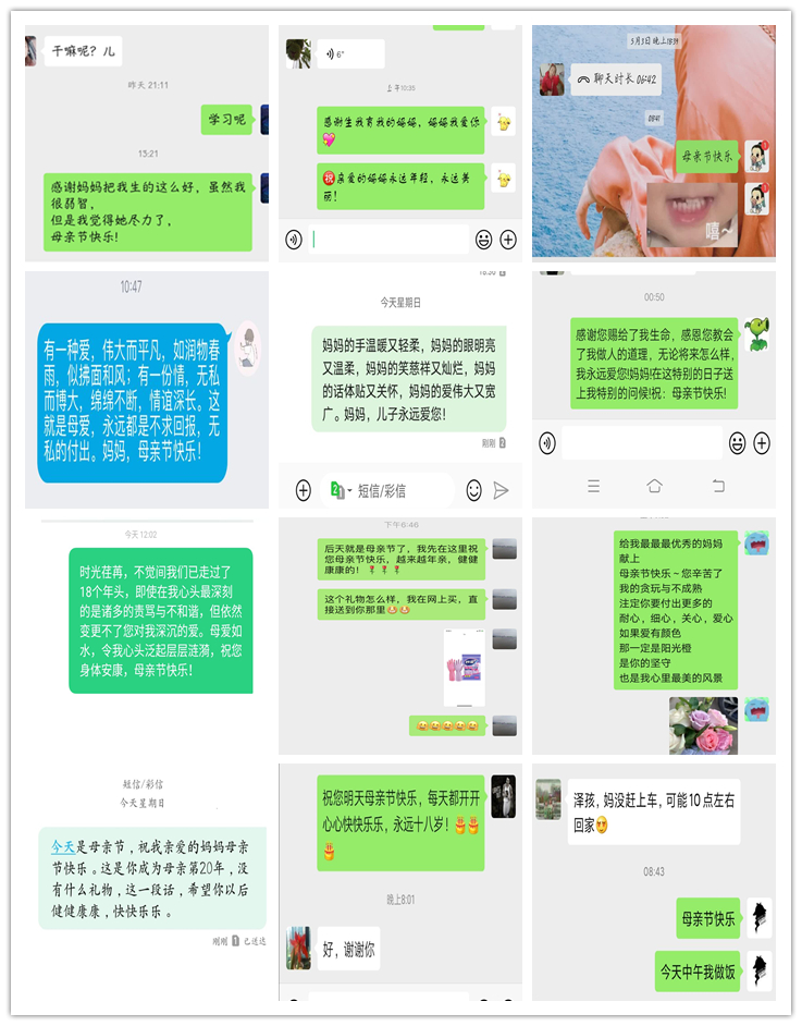 本网讯 五月的第二个星期日,一年一度的母亲节如约而至;五月,阳光灿烂,暖风拂面,在这样特殊的日子里,为引导同学们形成孝亲氛围,感恩母亲的无私与付出,电信学院的同学们纷纷行动起来,用实际行动感恩母亲。活动以线上征集的方式举行。
