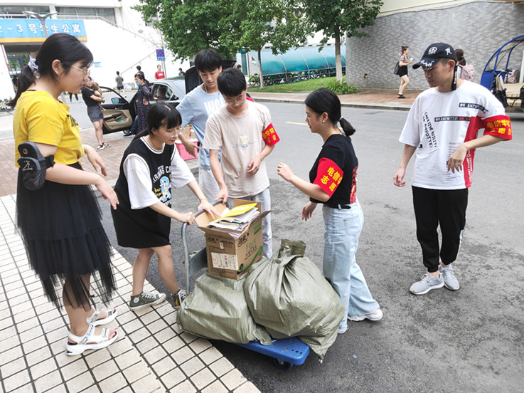 本网讯 硕果飘香季,毕业离校时,承载着母校的期盼与老师的嘱托,6月19日,电信学院22021届五百余名毕业生有序毕业离校,为共同营造文明、温暖的离校氛围,6月18日到6月20日,电信学院组织志愿者积极展开服务,表达对学长学姐们踏上新征程的祝福。