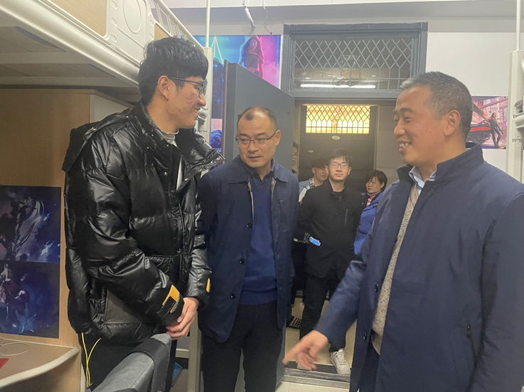 餐叙后,为进一步了解学生的住宿情况,闵杰前往三号宿舍楼走访调研。每到一个寝室,闵杰都仔细的查看宿舍卫生环境,了解同学们对于宿舍生活服务设施运行的真实感受。此外,他与同学们亲切交谈,详细询问他们的年级和专业背景,并鼓励同学们在做好学习和科研的同时,一定要注意疫情防控期间的自我保护。同学们对于闵杰的到来,也是倍感意外与惊喜,热情的向其介绍自己的宿舍成员,诙谐的宿舍名称、有趣的宿舍相处模式,让在场人员都忍俊不禁。