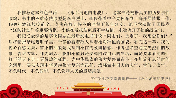 本次活动采用线上分享形式,受到同学们的积极响应。分享的每一本书,每一段话都表达着对中国共产党、对国家、对革命先驱的热爱与敬佩。