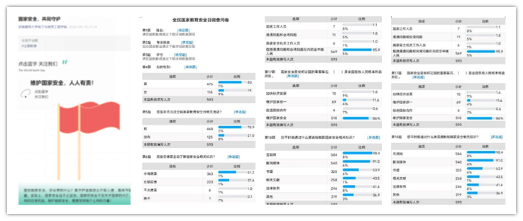 根据当前防控形势,本次活动通过线上形式开展。活动过程中,同学们主动学习国家安全知识,积极参加答题,共有600多名学生完成了线上问卷调查。调查显示,部分同学认为需要进一步加强国家安全教育,多数同学希望拓展更多渠道来获得国家安全知识。