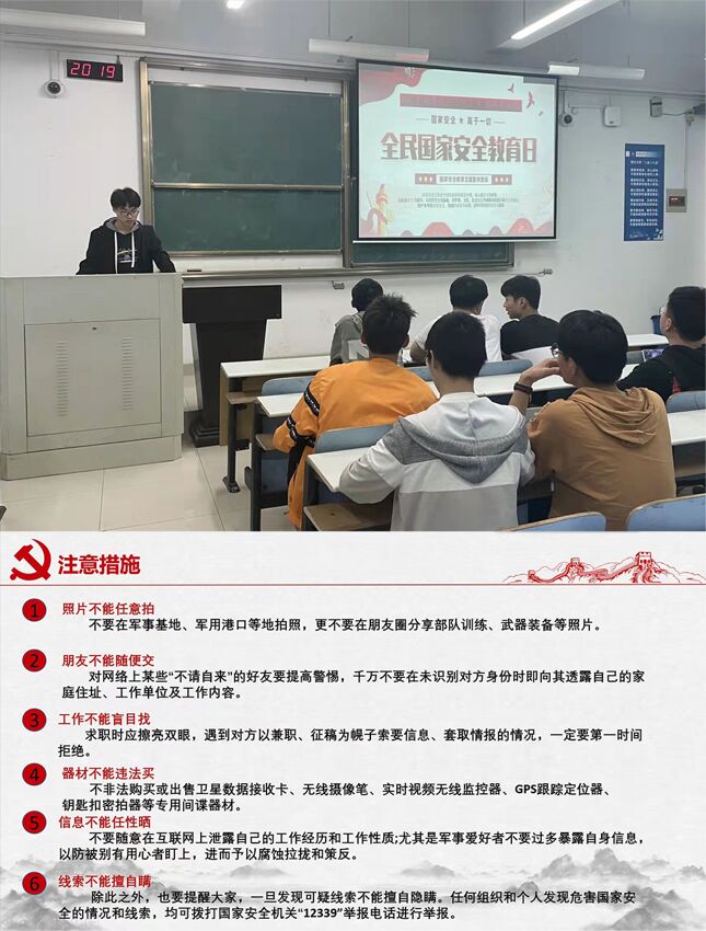 本网讯 2022年4月15日是第七个全民国家安全教育日。为深入贯彻落实总体国家安全观、进一步增强了学生党员的安全意识,电子与信息工程学院第六党支部开展“树牢总体国家安全观 勇担新时代新使命”主题教育活动。本次活动学习了解《国家安全法》、《反分裂国家法》、《国防法》、《反恐怖主义法》、《网络安全法》等国家安全相关法律等相关内容。活动通过展示国家网络攻击窃密等案例,引导学生理解国家安全观的科学内涵,认识保护国家安全的重要意义,提升学生辨别危害国家安全行为的意识。