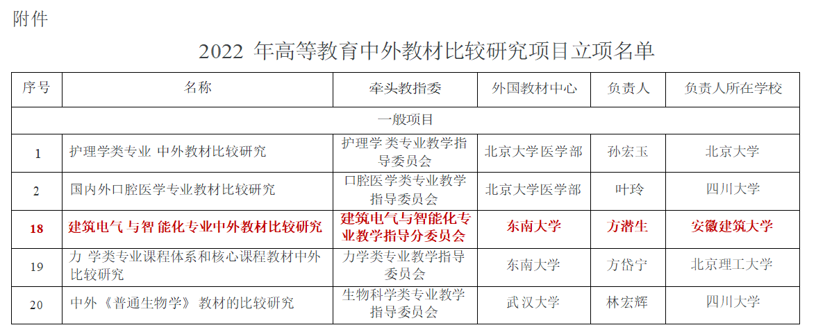 本网讯 近日,教育部高等教育司下发了《教育部高等教育司关于同意2022年高等教育中外教材比较研究项目立项的通知》,正式公布教育部高等教育司2022年高等教育中外教材比较研究项目立项建设名单。由我校牵头,联合东南大学外国教材中心、同济大学、西安建筑科技大学共同申报的“建筑电气与智能化专业中外教材比较研究”项目入选教育部高等教育中外教材比较研究项目立项,这是我校高质量教育体系建设的重大突破,也是我校建筑电气与智能化国家级一流专业建设和相关国家级一流课程建设的成果体现。