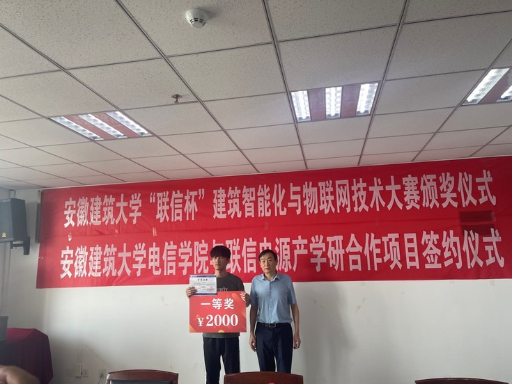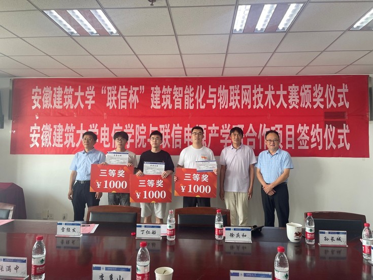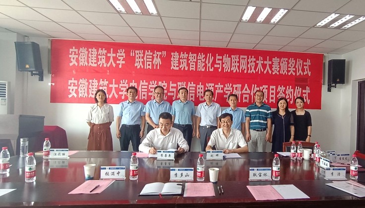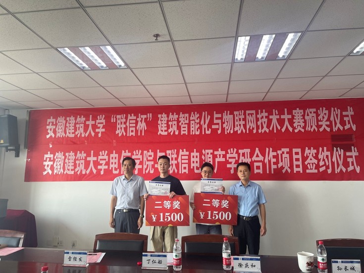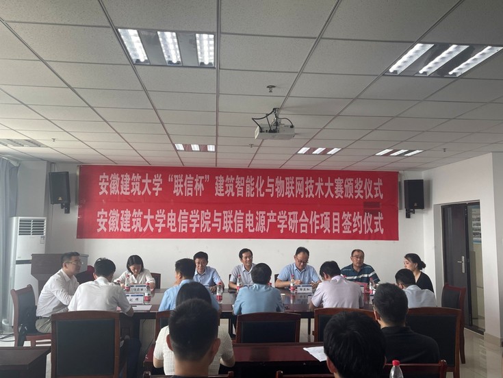 本网讯 6月16日下午,电信学院在1106会议室举办“联信杯”建筑智能化与物联网技术大赛颁奖暨产学研项目签约仪式。校党委常委、统战部长、教务处长丁仁船,学工部部长徐庆和、科技处副处长雷经发、合肥高新区政法处处长张满中、合肥联信电源有限公司董事长李多山、电信学院党政班子和老师、公司相关部门负责人参加仪式活动。