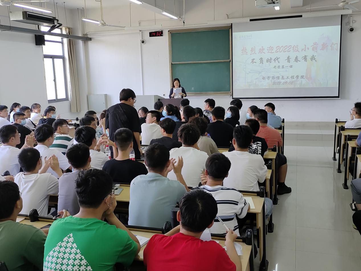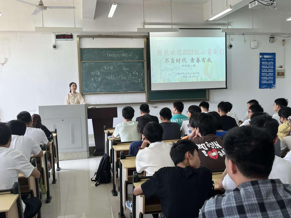 本网讯 9月2日,电子与信息工程学院“不负时代,青春有我”开学第一课主题班会在逸夫楼举行,由此,电信学院2022级新生入学教育系列活动正式拉开帷幕。电信学院各位新生辅导员给2022级新同学们带来了一场别开生面、内容丰富的精彩班会。