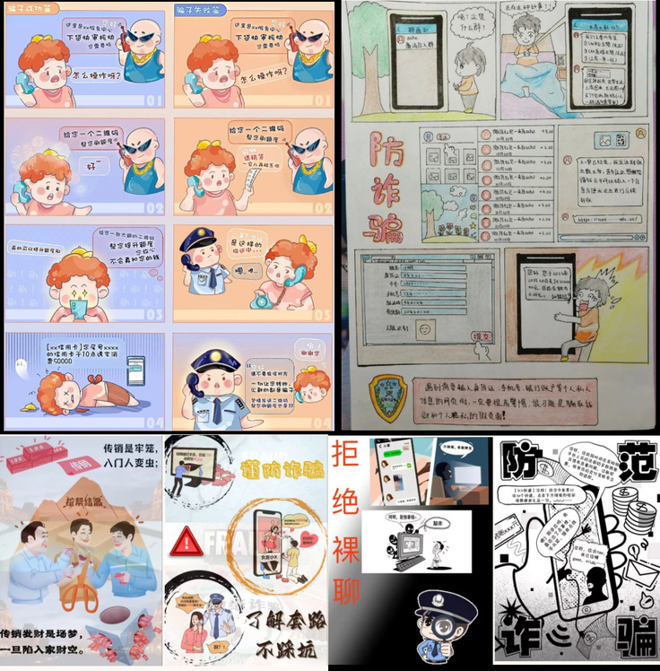 本次活动以“防范电信诈骗,守护财产安全”、“认识传销真相,戳穿美丽谎言”为主题。活动一开始便受到同学们的积极响应,优秀作品层出不穷,他们围绕活动主题以手绘或专业绘图软件的方式,结合实际案例进行绘画设计,作品内容充分突出识别以及防范电信诈骗和传销的方法途径,同时,宣传了防范和打击电信诈骗、传销的重要性。