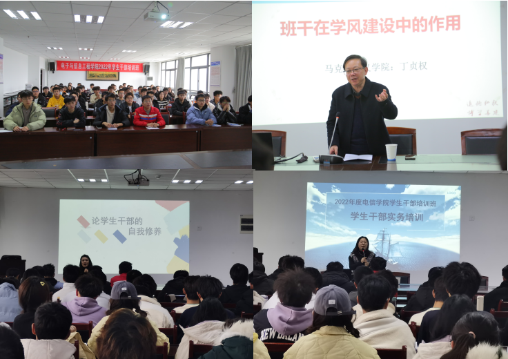 本网讯 为深入学习贯彻党的二十大精神和习近平总书记关于党的青年工作的重要论述,引导学生干部切实履行好工作职责,近日,电信学院在实验综合楼1106会议室举办2022年学生干部培训班。学院领导班子成员、辅导员代表和2022级本科生和研究生班干参加培训。本次培训班分别邀请学院领导班子成员、马克思主义学院教师和院学工办老师为学生带来了四次精彩的讲座。