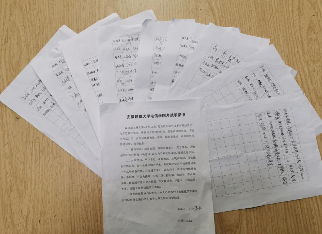 同时,辅导员组织各班级签订“学生考试诚信承诺书”,要求全体学生谨记承诺内容,摒弃投机心理,自觉抵制舞弊行为,激发学生承诺践诺,言出必行,提升学生的道德品行和学习动力。