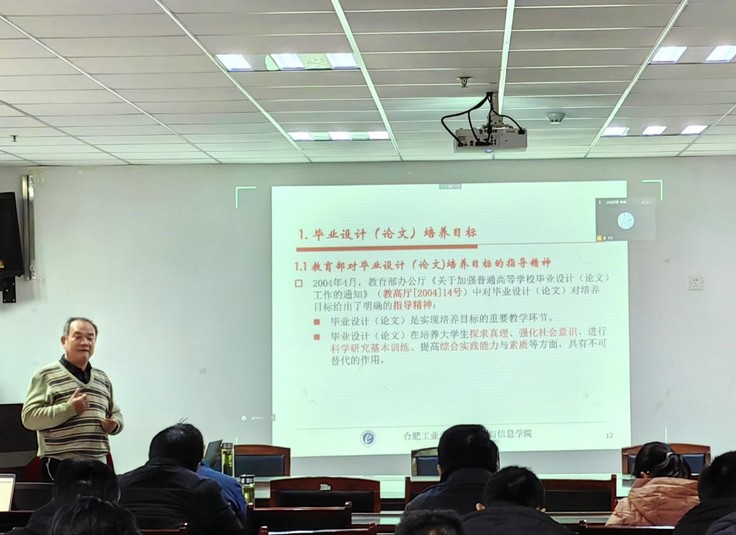 本网讯 为加强本科毕业设计(论文)的规范化管理,提高学生毕业设计(论文)质量,推动本科教育教学审核评估和专业认证工作顺利进行,12月7日,电信学院邀请教育部计算机类专业指导委员会委员、安徽省高校计算机教育研究会理事长、教育部工程教育认证专家、合肥工业大学博士生导师胡学钢教授以“毕业设计(论文)教学设计与建设”为题做了专题报告。