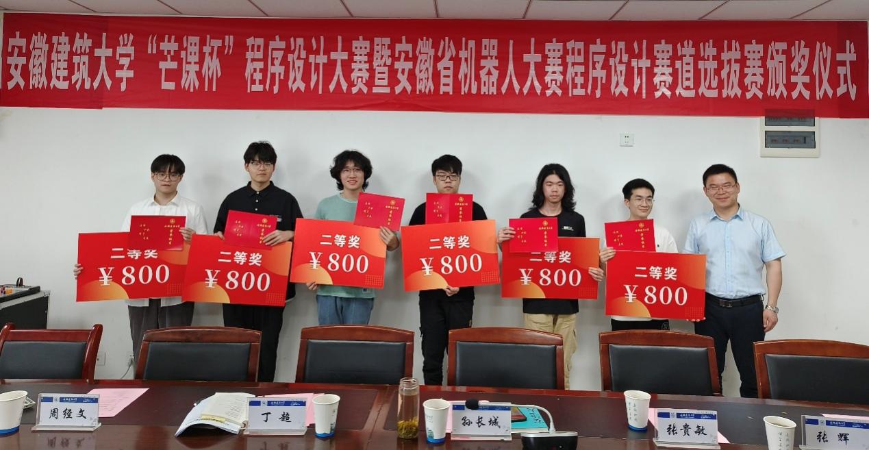 本网讯 6月7日下午,第二届ku游官方“芒课杯”程序设计大赛暨安徽省机器人大赛程序设计赛道选拔赛颁奖仪式在电信学院会议室举行,校教务处副处长、创新创业学院副院长丁超,电信学院党委书记孙长城,安徽芒课教育科技有限公司副总经理张贵敏,技术总监周经文,市场运营总监张辉,竞赛指导教师代表以及获奖学生参加了颁奖仪式,电信学院副院长汪莉丽主持颁奖仪式。