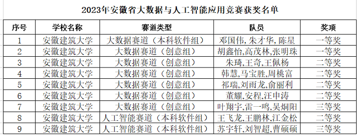 本网讯 近日,安徽省大数据与人工智能应用竞赛在合肥举行。电信学院学子荣获安徽省一等奖2项,二等奖5项和三等奖2项的佳绩。