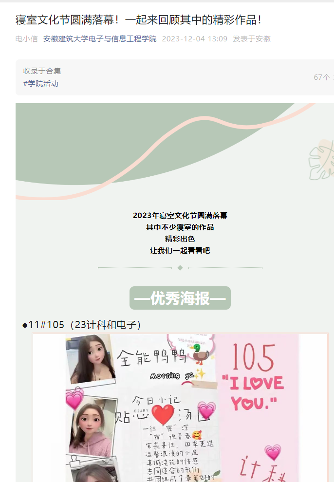 本网讯 为丰富校园文化生活,营造美好和谐、积极向上的宿舍环境,电信学院近期开展了以“营造宿舍安全氛围,创造温馨生活环境”为主题的寝室文化节系列活动。