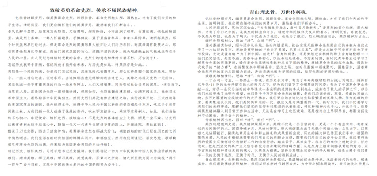 本次征文活动得到了同学们的广泛关注和积极参与。来自各专业的参赛同学们以独特的视角和生动的笔触讲述了一个个感人至深的故事,展现英雄先烈无私奉献的崇高精神。参赛作品不仅表达了对先烈的敬仰之情,更激发了读者们的爱国热情。