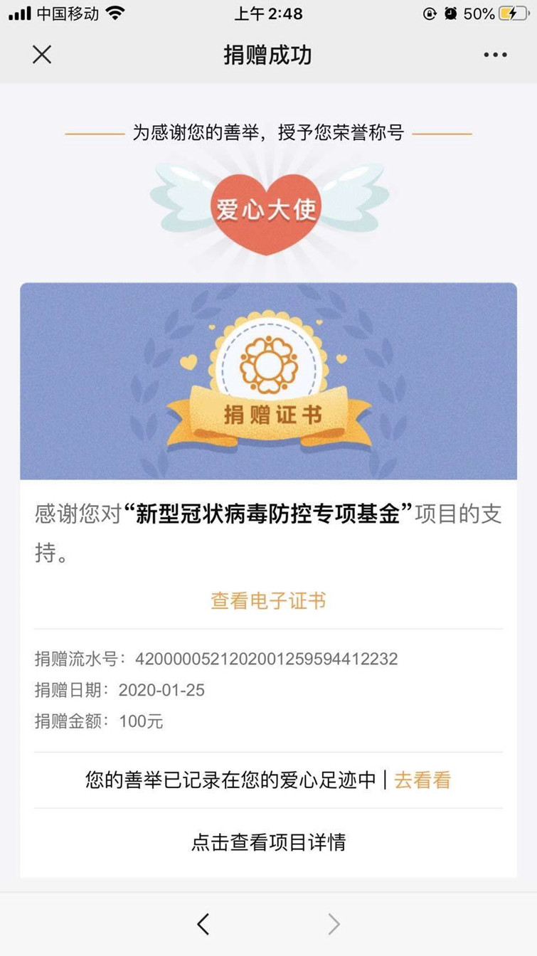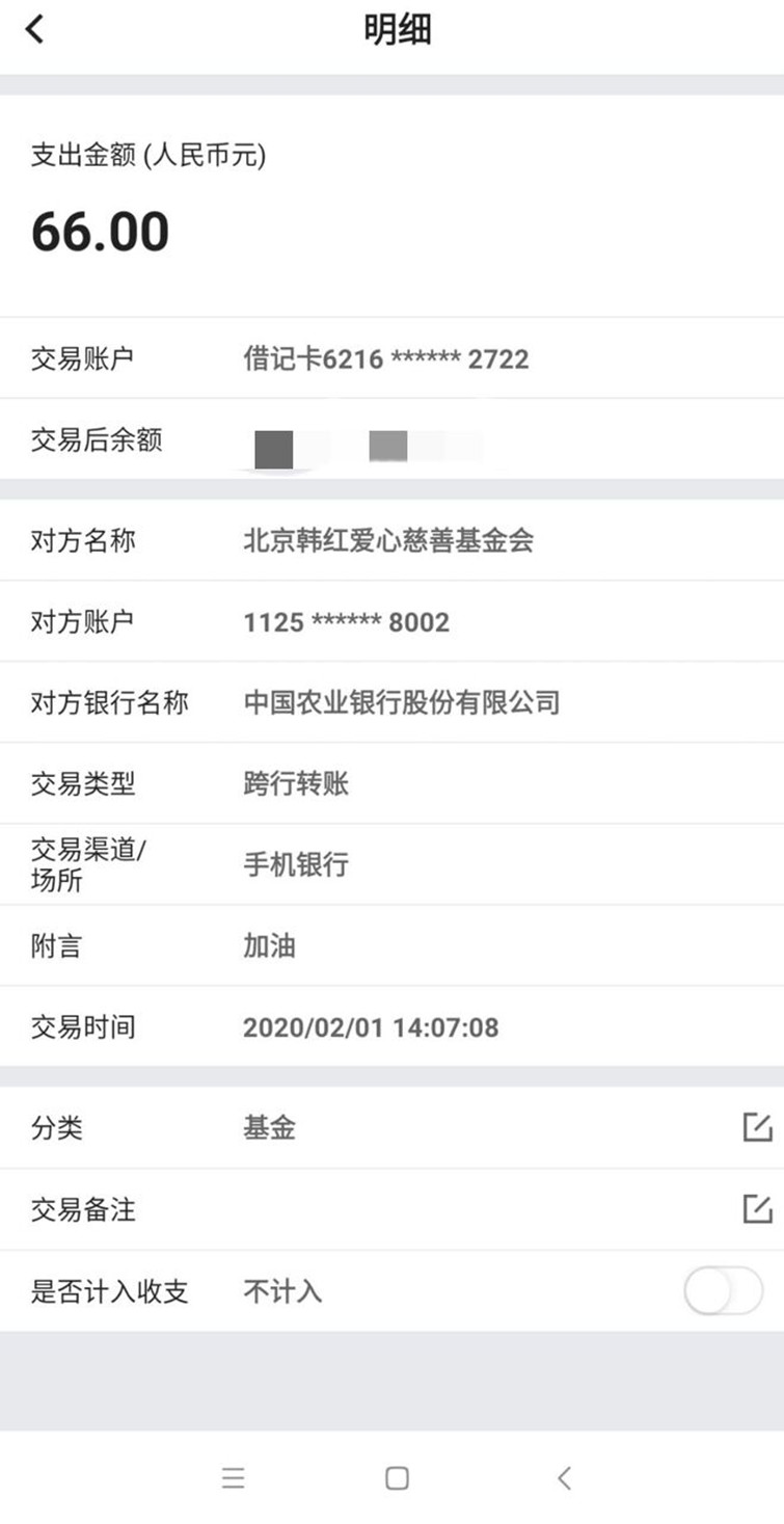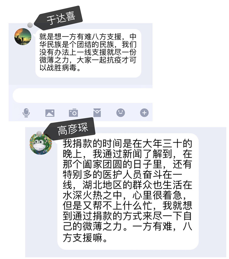 “中华民族是个团结的民族,大家一起抗疫才可以战胜病毒”,这是于达喜朴实的想法,也是高彦琛的,两人分别于1月25日向武汉慈善总会和2月1日向北京韩红爱心慈善基金会捐款。