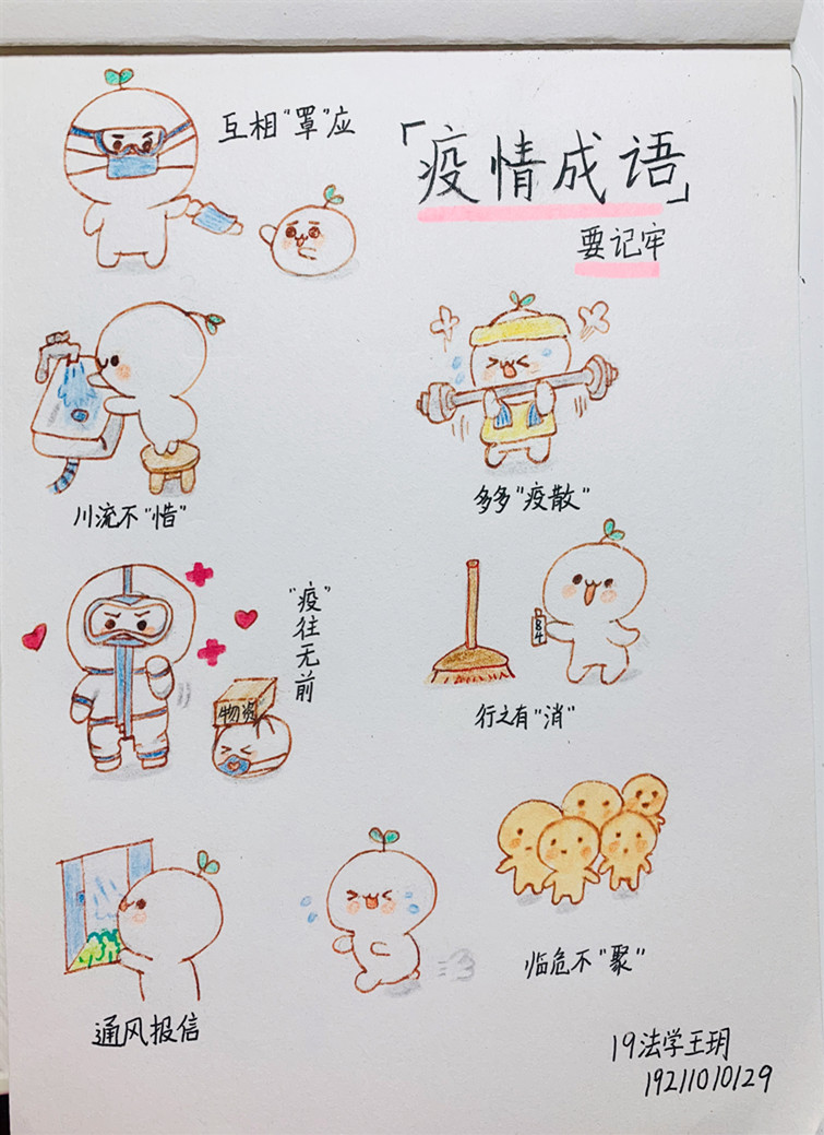 19法学的王玥同学以漫画创新的方式向大家展示了疫情期间的注意事项,帮助大家轻松愉快的掌握疫情防控知识;18人力资源的王晓洛同学用心制作了视频,声情并茂、扣人心弦,表达了对武汉和中国抗疫胜利的信心;16法学的裴玮同学以一幅展示春天花草的刺绣表达了疫情期间对“春天”到来的渴望。每一幅文创作品,都凝聚了创作者的心血,表达了公管学子对抗击疫情必胜的决心。