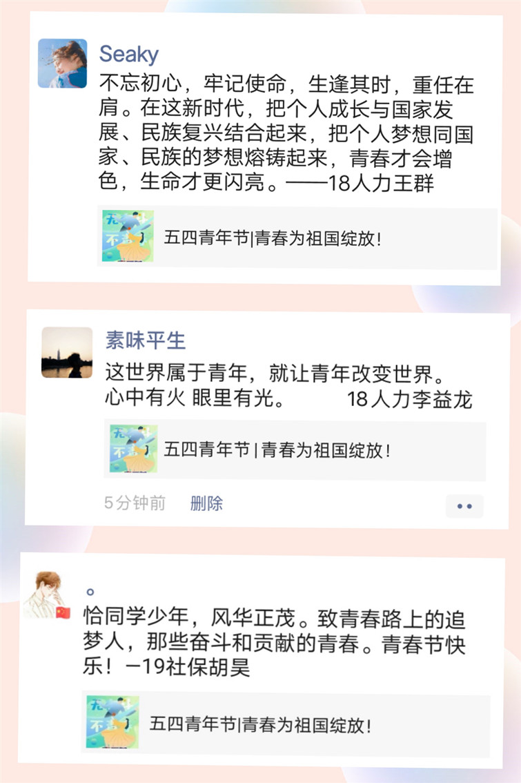 本次活动涵盖学习习近平总书记对青年的寄语、红色经典影片赏析等线上活动,全体公管学子聆听革命故事、接受精神洗礼。公管青年线上同赏电影《建党伟业》,重温中国共产党走过的峥嵘岁月,积极分享自己的观影感悟,热情讴歌老一辈革命家的丰功伟绩,缅怀革命先烈。同时,公管学子积极学习习近平总书记对青年的寄语,并开展线上交流学习,大家纷纷表示要坚定理想信念,争做有为青年;严格要求自己,争做勤学青年;不拘泥于现状,争做创新青年。