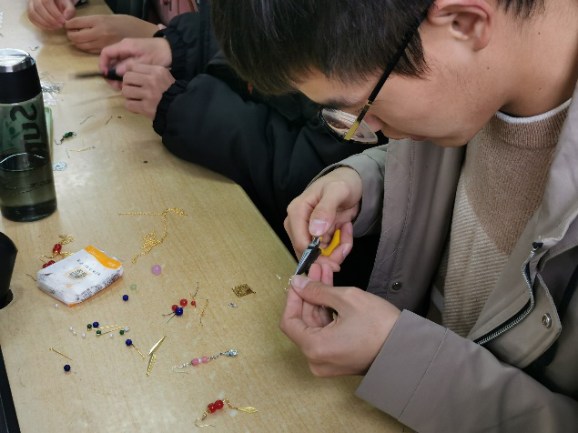 本次发簪教学主要是学习制作耳饰,因为有了第一次学习制作发簪的经验,同学们对材料的选择和工具的使用更加得心应手。通过负责人的示范和指导进行一步一步的耳饰制作,花片、流苏等各种常见的材料在大家手中慢慢的变成了一件件艺术品,宛如春天的一朵朵花儿在同学们的手中绽放。活动期间不断有人向负责人请教问题,大家对此活动的参与热情持续高涨。