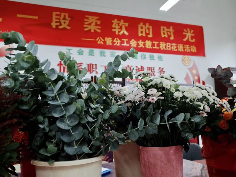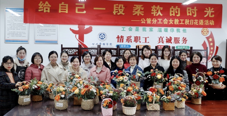 本网讯 为丰富教职工的精神文化生活,11月25日中午,公管学院分工会组织女教工相聚职工小家参加秋日花语活动。和鲜花一起,以喜欢的方式动手创作并感受从自己手中绽放的浪漫。