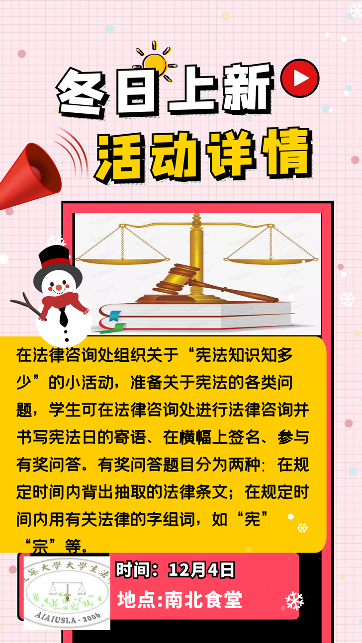 本网讯 2020年12月4日,是我国第七个国家宪法日,也是第二十个全国法制宣传日。为了培养学生们宪法意识,提升法治素养,12月的第一周,ku游官方公共管理学院法律协会和学生会联合开展了宪法宣传周活动,弘扬宪法精神,传递依宪治国、依宪执政的理念。