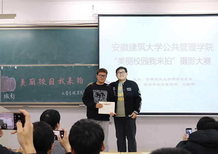 参赛选手依次上台展示拍摄作品并讲述拍摄时的灵感和心得体会。黄昏下的易海风光,已成为建大靓丽的风景线;暮色下庄重的教学楼,映衬出校园的魅力;一张张校园生活照更加使校园充满生气。比赛互动环节,随机抽取现场观众点评自己喜爱的作品并赠送印有校园美景的明信片。最终,来自20法学的帅涛同学以一组校园生活照获得第一名。