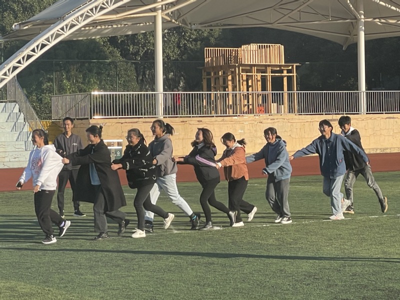 下午,同学们围坐在操场草地上,沐浴着午后的阳光,感受着和煦温暖。本次活动设置了许多趣味性强的团建游戏,其中以坐地起身、数字炸弹、蒙眼摸人等游戏最受同学们的喜爱。同学们积极参加、全情投入、互助互信,充分发挥团队力量,一起挥洒汗水,竭力完成每个项目,在活动中共同感受团队协作与信任的重要性。游戏中,大家不停地奔跑着、跳跃着、欢呼着,拉近了彼此间的距离,收获了宝贵的友谊。