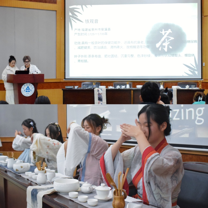伴随着优雅的古典音乐,从布置一方茶席开始,茶礼仪贯穿始终。通过茶艺知识教学,同学们学习了行茶仪轨,认识了茶器,了解了茶席布置的规则。在奉茶礼仪中,从配器、赏茶、温杯、投茶,到摇香、洗茶、正式冲泡、分茶,通过一招一式的行茶练习,同学们切身感受到“礼”的重要性。中国作为文明古国,享有礼仪之邦盛誉, “不学礼,无以立”,茶礼仪是中华礼仪文明的载体,通过茶艺学习,同学们提高了专注力,懂得了敬人,感恩,体会到和、敬、静、雅美,整场体验活动充满着书香、茶香,虽然饮的是茶,但看到的是美,体会到的是“礼”,净化的是心。