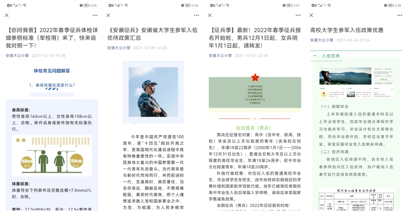 为推动大学生征兵宣传工作取得实效,实现征兵宣传工作全覆盖,学院还通过“安建大公小管”新媒体平台,定期推送相关征兵政策规定及宣传片,激发大学生应征入伍的积极性、主动性,引导和激励同学们支持国防、踊跃参军的热情,为春季征兵奠定良好的基础,确保征兵工作圆满完成。