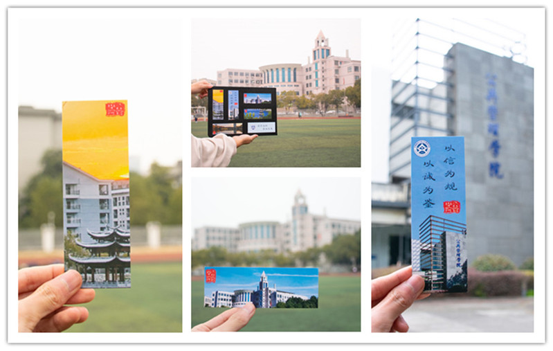诚信文创书签一套共5张,皆由学生自主设计,每张书签图案精美,意义深刻,一面写上诚信格言,如“以诚净心,以信正风”、“君子浩然,秉诚求是”、“笔墨,因真实而不朽”等;另一面则印着以易海亭、九月桥、北区公管楼和北区教学楼为选景的图片,希望通过这种新颖的方式,让同学们在诚信格言、美丽校园中领略诚信之美、诚信之道。