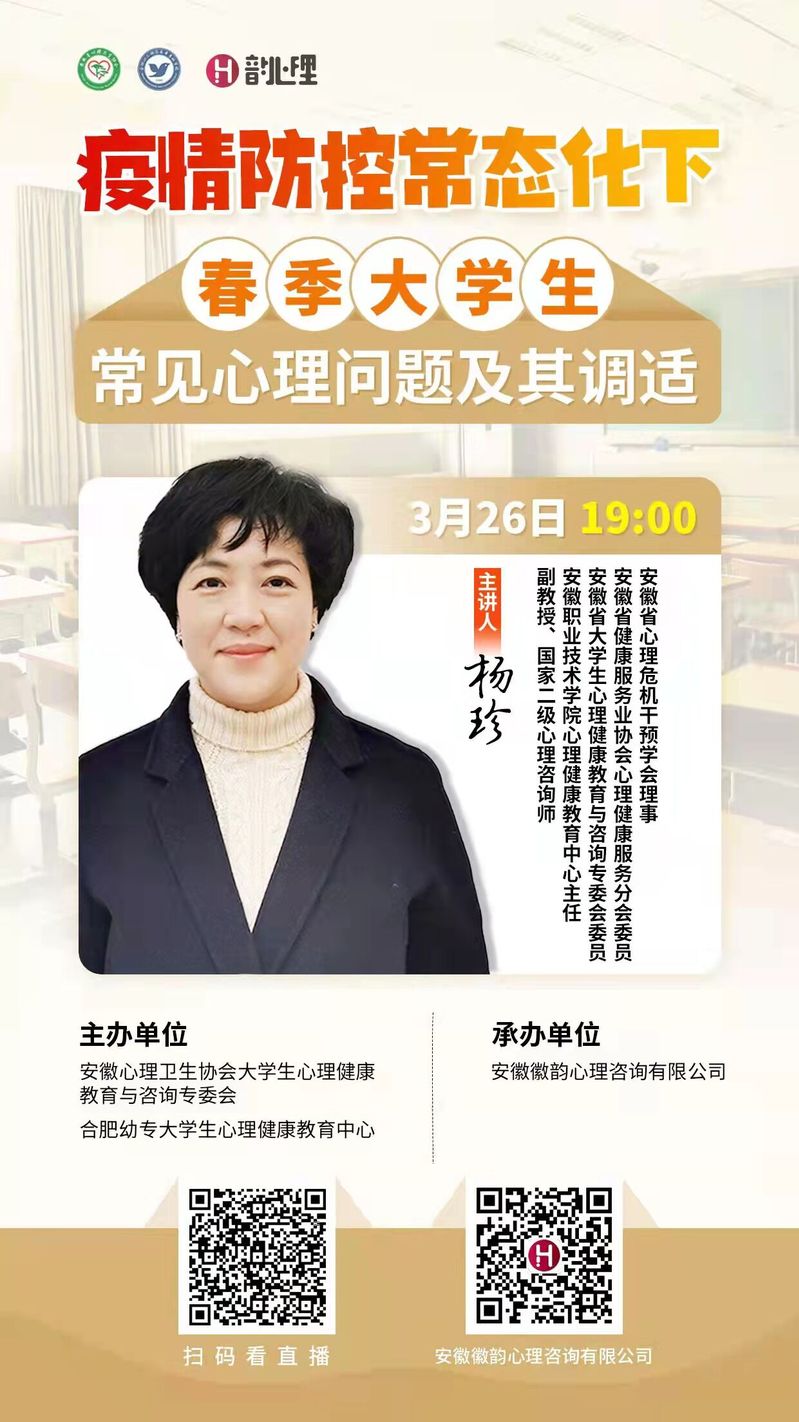 本次“疫情防控常态化下春季大学生常见心理问题及其调试”心理直播课是由安徽心理卫生协会大学生心理健康教育与咨询专委会、合肥幼专大学生心理健康教育中心与徽韵心理咨询有限公司联合举办,特别邀请安徽省心理危机干预学会杨珍理事,针对春季大学生特别是在疫情防控常态化下常见心理问题进行疏导及调试,引导广大学生提高心理免疫力,增强自我情绪调节能力,坚定战胜疫情信心!(文/图:吴永杰 魏雪影;审稿:李道先)