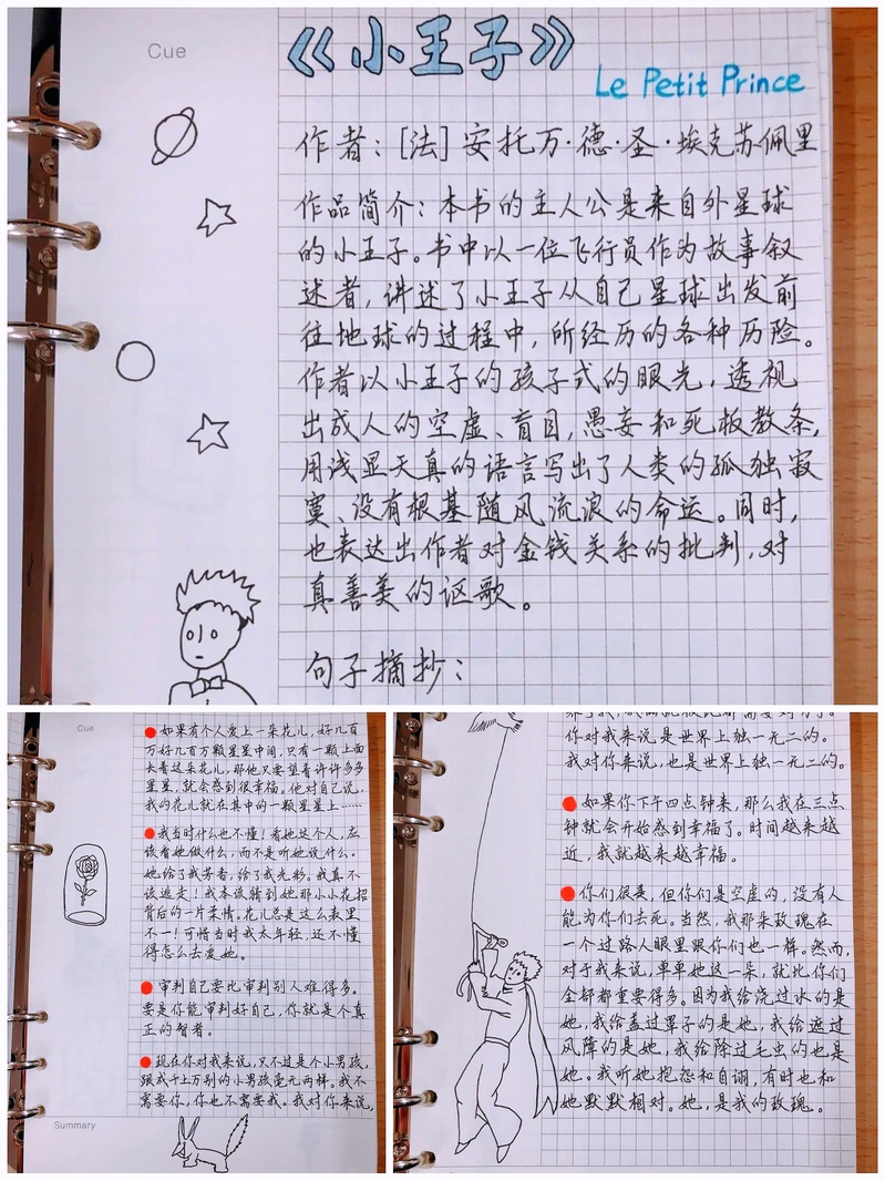 西塞罗曾说:“读书可以抚育青年,慰藉老年。读书可以增进幸福,消灾解愁。在家时,给你带来快乐;外出时,让你心旷神怡。”书籍中的话语仿佛闪着光,有种让人忍不住誊抄的魔力。看这精美的笔记,凝聚了主人读书的收获与心血,又何尝不是一件艺术品呢?读书笔记让每个人都成了黑白纸张上的艺术家,专心致致地创作属于自己的悦读世界。