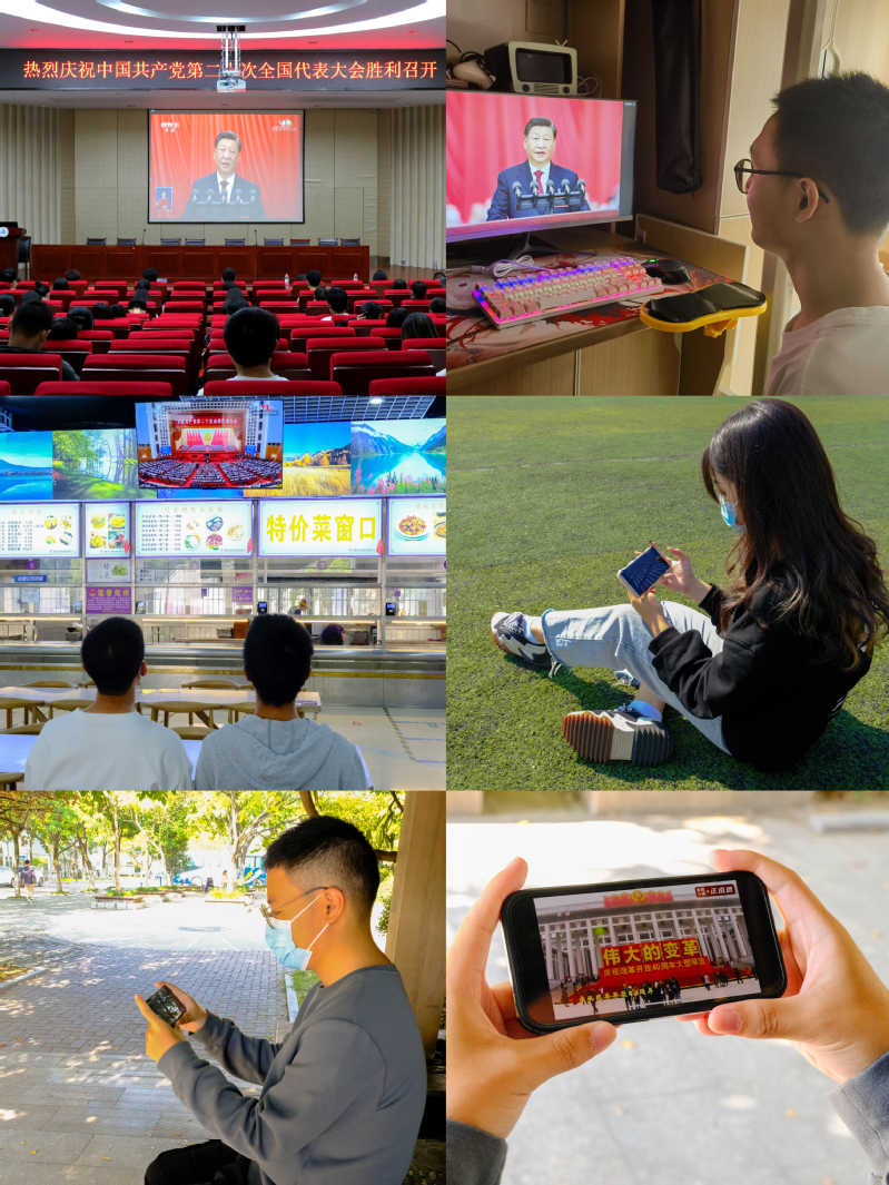 本网讯 举世瞩目的中国共产党第二十次全国代表大会于10月16日上午10点在北京胜利开幕。公共管理学院组织学生在图书馆报告厅、F楼社团活动中心、研究生工作室、宿舍等区域观看二十大开幕会直播,彰显公管学子关心国家大事、与祖国同频共振的良好政治风貌。