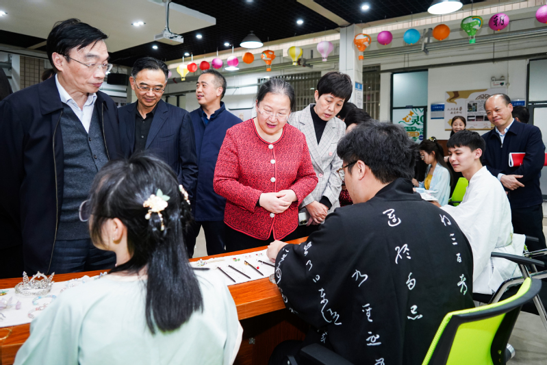 刘苹、龚明珠、刘少华一行走访学生社团活动中心、模拟法庭等,观看了小隐茶艺社的茶艺表演、朝含国学社的书法展示和发簪制作,和学生亲切交流发簪制作工序、茶艺冲泡技巧、书法欣赏和练习,充分肯定了他们在传承国学文化方面的情怀,高度赞赏在校大学生的多才多艺和多元发展的课外生活,鼓励青年学生继续传承优秀传统文化,躬身实践、踔厉奋发、学而有为、筑梦芳华。