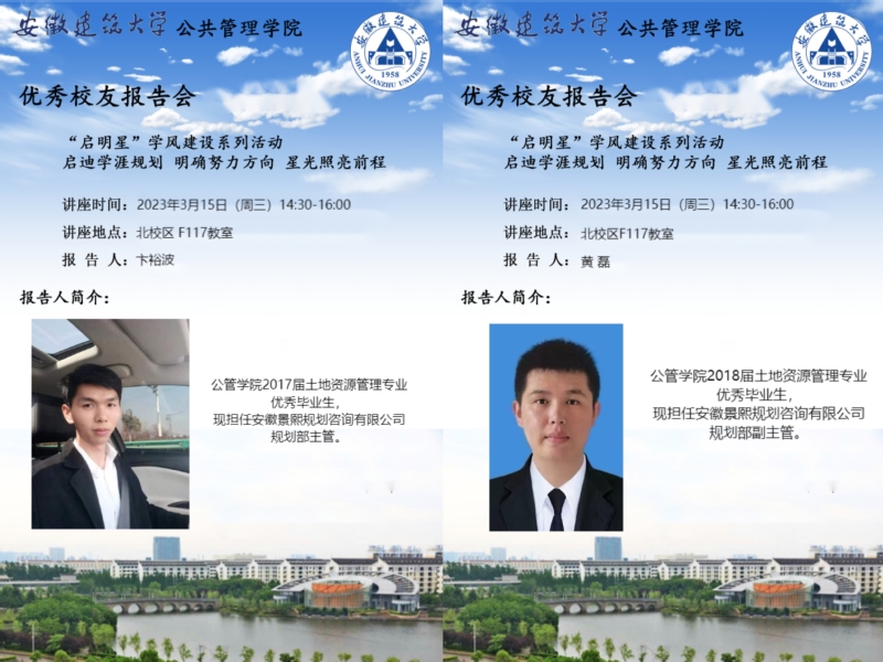 本网讯 为帮助新生增强专业认同感,进一步明确奋斗目标,合理规划大学生活,3月15日,公管学院举办“启明星”学风建设——优秀校友交流会活动。学院邀请优秀校友卞裕波、黄磊担任主讲,学院辅导员代表,2022级土地资源管理专业、城市管理专业全体学生参加。