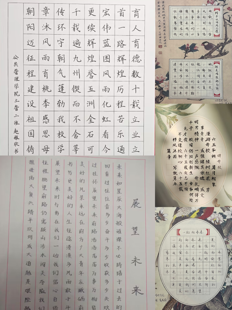 书法比赛内容为优秀古今经典文学作品、原创校庆祝福文章等。通过层层选拔,共遴选出37副作品参加此次决赛。同学们满怀热情地书写着对书法的热爱、对母校的祝福,字迹或劲健、或婉转;或如婀娜窈窕的女子、或如矫健勇猛的壮士;或如春风拂面繁花一片,或如北风入关深沉冷峻。一幅幅赏心悦目的硬笔书法作品展示着同学们深厚的书法功底。经评审,2022级土管专业赵雅欣、21级公共管理专业研究生唐桉和陈彤荣获一等奖;2022级人力专业李诗迪、22社保任程程和崔冰冰等6人荣获二等奖;2022级法学专业张宝怡、2022级城管专业、2021级公共管理学院研究生李睿等9人荣获三等奖。