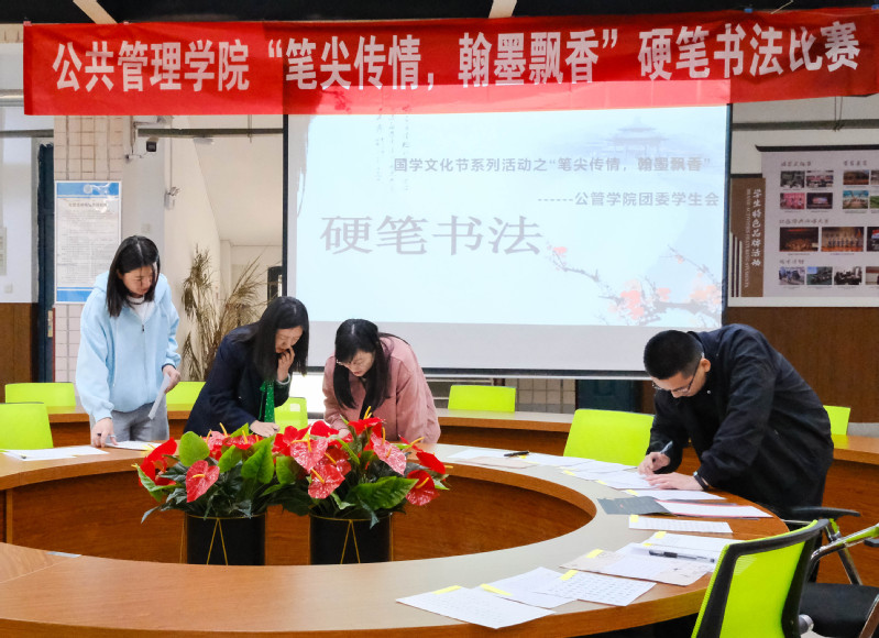 挥毫书祝福,丹心诵中华。此次硬笔书法大赛为公管学子提供展示自我的平台,激发大学生对国学文化和语言文字的热爱,促进大学生积极传承书法风采、养成严谨认真书写汉字的习惯,营造了良好的书香校园氛围,对弘扬中华传统文化、增强大学生的文化自信和爱校爱国情怀具有十分重要的意义。(作者:牛勤陈梅林兴勇;审稿:马晓艳)