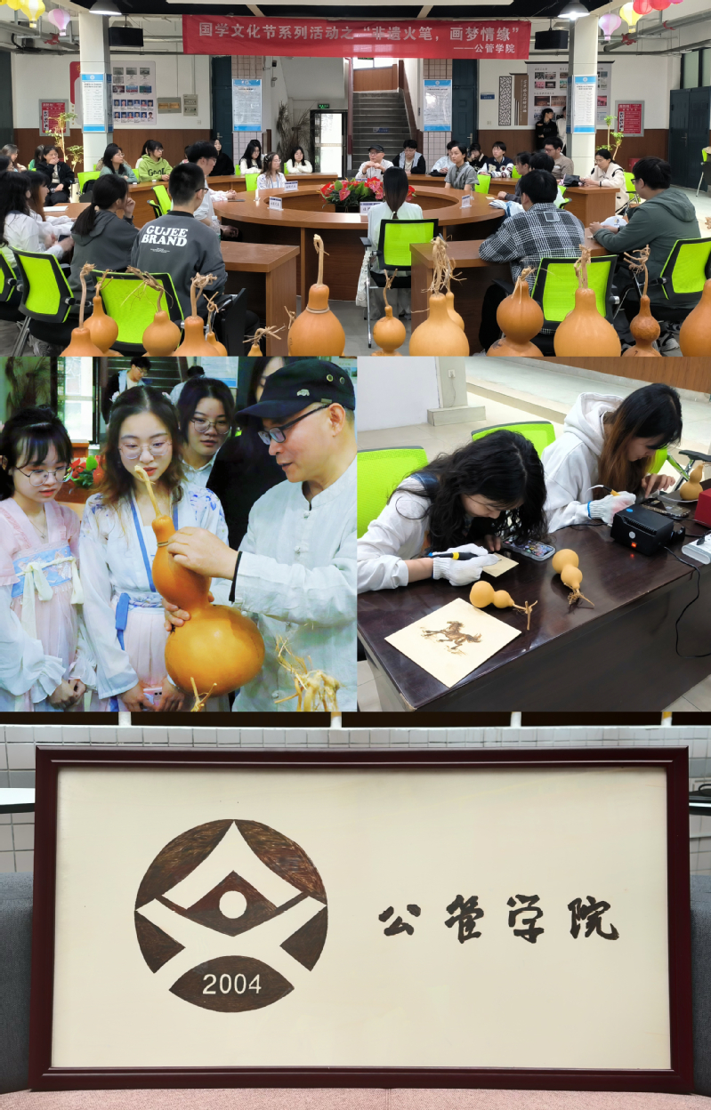 火笔画又名烙画源于西汉,盛于东汉,是一种古老的绘画形式。安徽“火笔画”的特征是以“铁”作笔,以“火”为墨,在竹板、竹簧、宣纸等不同材料上作画。公管学院邀请非遗葫芦烙画传承人郑小良解说安徽“火笔画”的发展历史、展示葫芦烙画的创作过程。