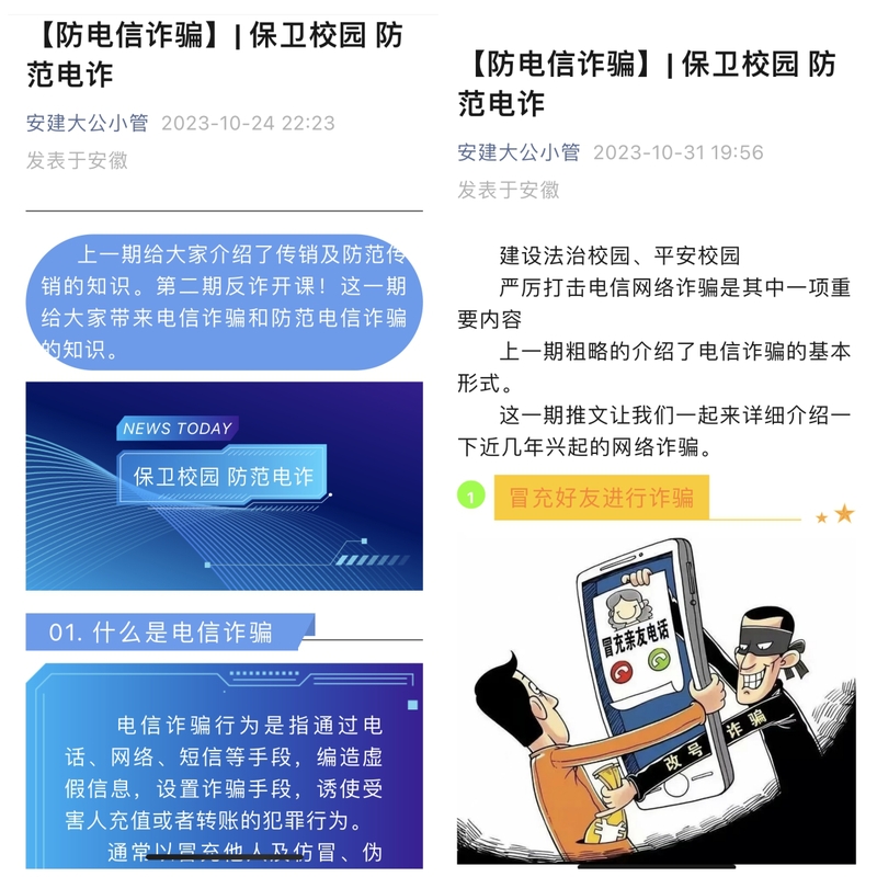 推动反诈宣传工作取得实效实现反诈宣传工作全覆盖学院通过“安建大公小管”新媒体平台,定期推送防范电信网络诈骗相关知识法律法规揭露常见诈骗犯罪手法与典型案例进一步筑牢广大学生的反诈思想防线,织密反诈安全防护网