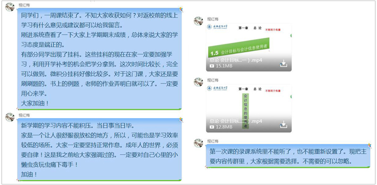 对于很多教师来说,化身“网络主播”实属从教生涯的第一次。为确保按期保质开课,经管学院全体教师加班加点,“恶补”突击,很多老师从外行变成了内行,从“技术盲”成长为“技术流”。不仅能够熟练掌握一个教学平台,而且能够在不同教学平台间任意切换,多渠道协同配合,保证线上教学效果的落地落实。与此同时,老师们也经常在工作群中分享做“网络主播”的经验趣事,积极探索、群策群力,经过几周的不断调整,目前线上教学秩序井然、平稳有序。