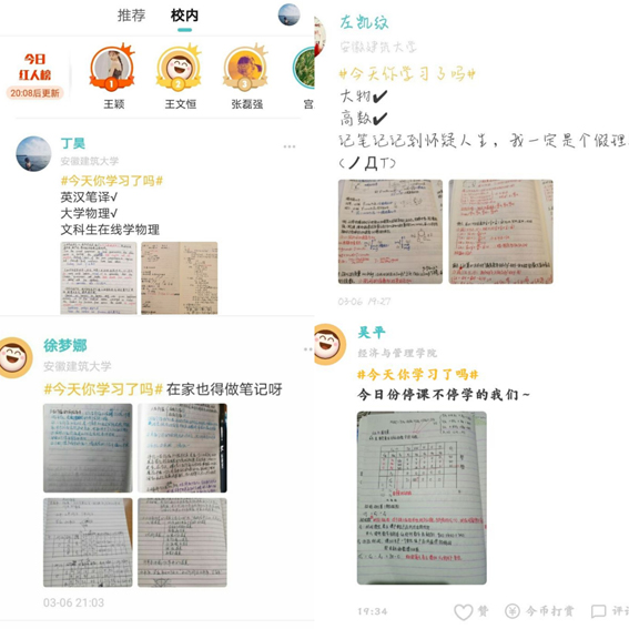 活动以今日校园APP中设置的“今天你学习了吗”话题下进行打卡,晒出自己居家时期每日上网课的笔记和作业。通过丰富的打卡形式,包括视频打卡、照片打卡、APP打卡等,辅之老师们的及时引导、解惑、答疑,既可以增加学生间的相互交流和学习,同时也可督促学生养成做笔记的好习惯。笔记分享实现了知识的“云共享”,同时又能对笔记中存在问题的地方及时进行讨论,达到优势互补,共同进步的效果。