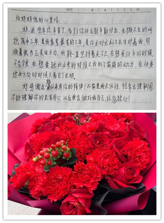 19工管一班的王洪同学在给母亲的一封信中写道:“妈,感谢这一路以来有你的陪伴!以前是我太任性,经常无理取闹,不能理解你的良苦用心,以后我会做好我自己,让您放心!”