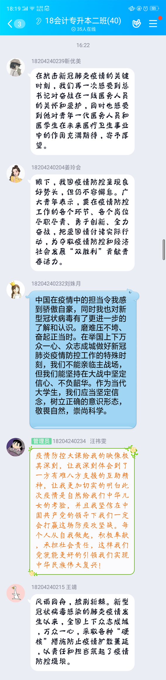 通过此次线上主题团日活动,经管学院的青年学子们更加体会到时代赋予自身的使命与担当,激发了学生们学习和投身社会建设的热情。相信在党和政府的领导下,在医务人员的坚守和努力下,在广大中国同胞的众志成城下,我们一定能打赢这场战“疫”,迎来我们最美的春天!(作者:刘晓丹 王拓 徐礼滨;审稿:帅英)