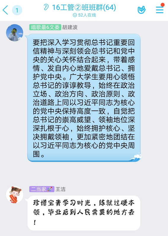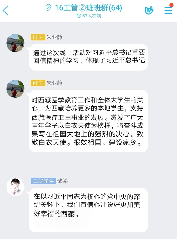 本网讯 近日,经管学院组织青年学子认真开展学习习近平总书记给首钢医院实习的西藏大学医学院学生回信精神线上团日活动,各团支部团员参与了积极而热烈的讨论,感悟颇深。