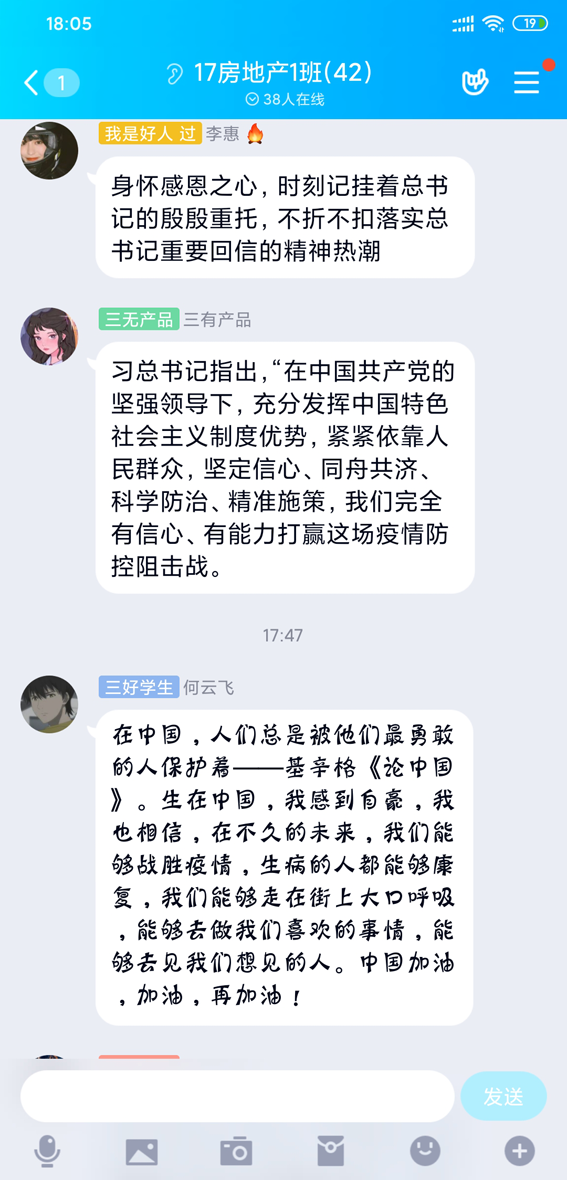 虽然无法像医务工作者一样救死扶伤,但会以医务工作者为榜样,时刻牢记习近平总书记对广大青年学生的殷切期待,努力学习专业知识,练就过硬本领,锤炼品德修为,早日有能力投身到祖国和人民需要的地方,不忘初心,牢记使命,用实际行动肩负起新时代青年的使命和担当。我们坚信,在中国共产党的领导下,充分发挥中国特色社会主义制度优势,紧紧依靠人民群众,我们完全有信心、有能力,攻坚克难,坚决打赢这场疫情防控阻击战。